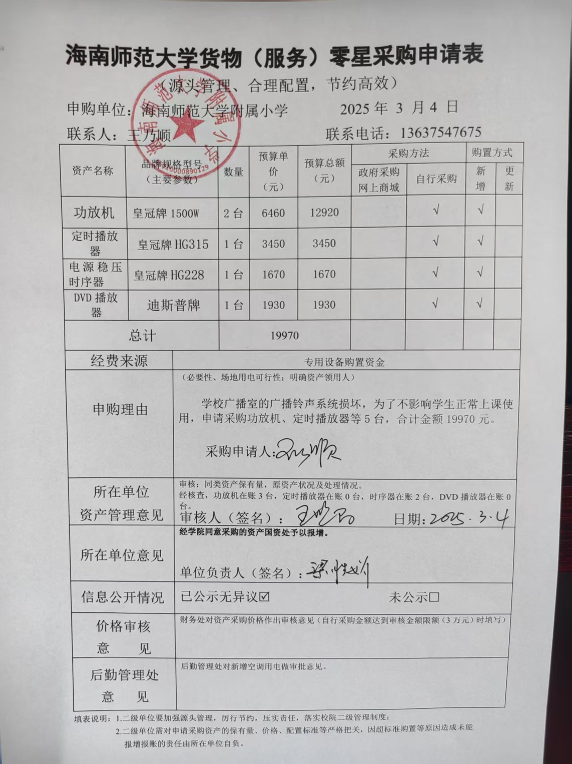 学校广播室的广播铃声系统损坏,为了不影响学生正常上课使用,申请采购功放机、定时播放器等5台,合计金额19970元。