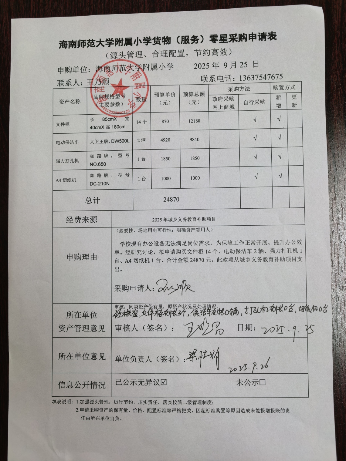 颜射 现有办公设备无法满足岗位需求,为保障工作正常开展、提升办公效率。经研究讨论,拟申请购买文件柜14个、电动保洁车2辆、强力打孔机1台、A4切纸机1台,合计金额24870元。