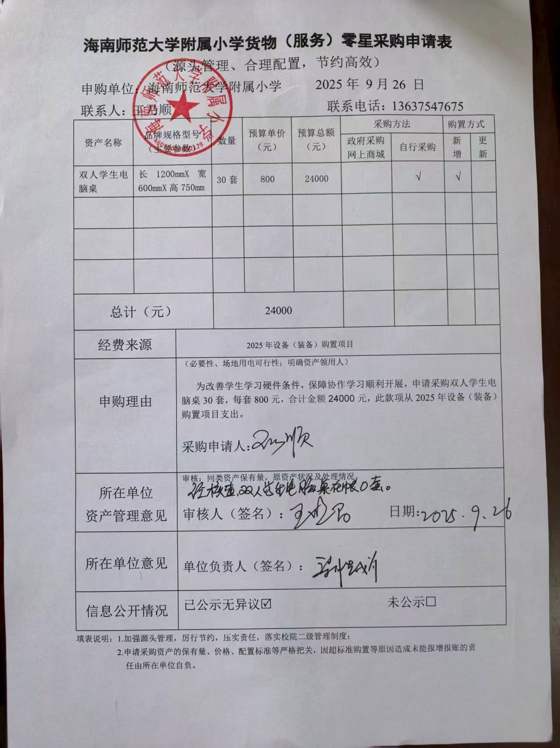 为改善学生学习硬件条件,保障协作学习顺利开展,申请采购双人学生电脑桌30套,每套800元,合计金额24000元。