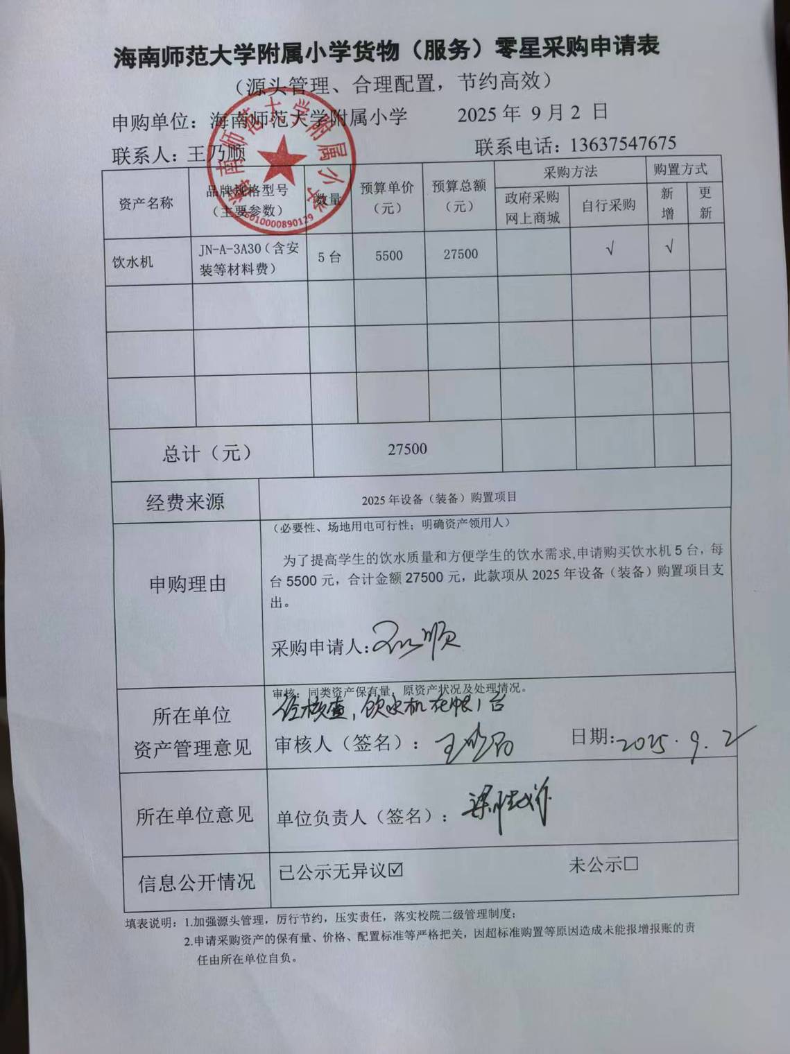 为了提高学生的饮水质量和方便学生的饮水需求,申请购买饮水机5台,每台5500元,合计金额27500元。