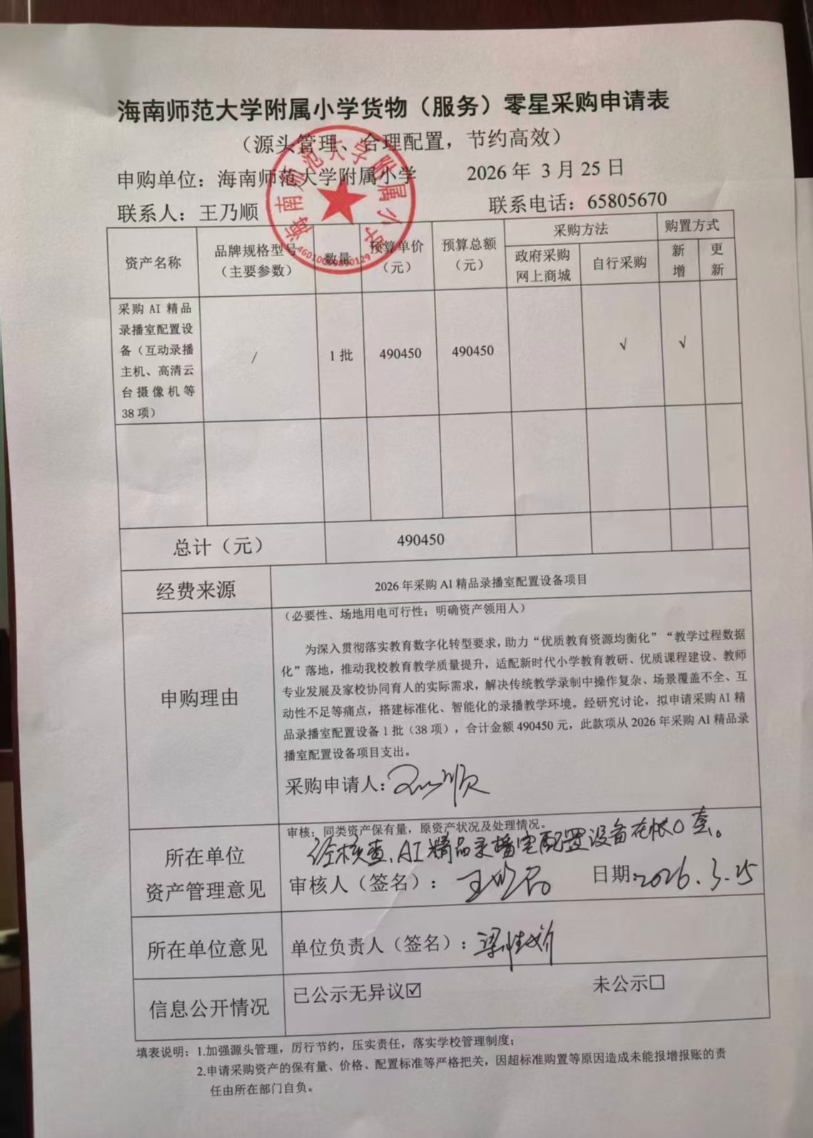 为深入贯彻落实教育数字化转型要求,助力"优质教育资源均衡化""教学过程数据化"落地,推动颜射 教育教学质量提升,适配新时代小学教育教研,优质课程建设,教师专业发展及家校协同育人的实际需求,解决传统教学录制中操作复杂,场景覆盖不全,互动性不足等痛点,搭建标准化,智能化的录播教学环境。经研究讨论,拟申请采购AI精品录播室配置设备1批(38项),合计金额490450元。